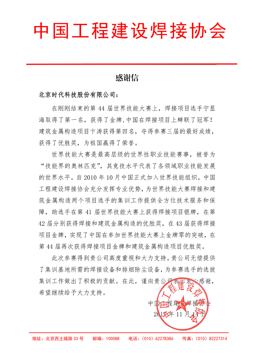 中国工程建设焊接协会感谢时代焊机提供世赛培训用机