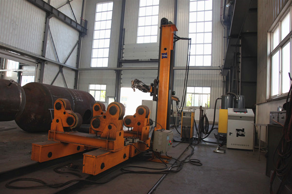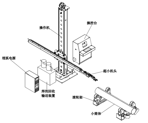 小筒体埋弧焊接专机主要用于筒体内🧖♂️、外纵缝的自动焊接,主要结构由焊接操作机和电动滚轮架组成;操作机主要由立柱(包括提升机构🥽、防坠落保险装置及配重部件)↗️、横梁(包括齿条及横梁驱动部件)、机头等部件组成。电动滚轮架由一组主动滚轮架、一组从动动滚轮架和底座组成。