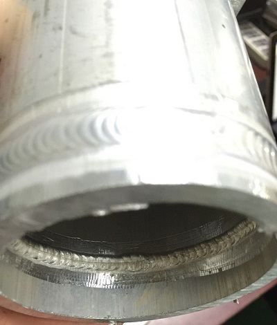 第二模块铝合金构建中铝管的焊接难点主要在于背部融透(如图6)和内在质量的保证。背部融透主要是考验选手对熔池的理解,在组对焊缝0间隙的情况下,如何能够识别熔池温度是否达到🎁,送递焊丝时间的选择💅,这些都至关重要,而且在焊接过程中🐖,由于铝合金的导热系数大👩🏻🏫,焊接过程中随着温度的上升,焊接速度也会越来越快,如果手法跟不上🛴,只是依靠小电流慢速焊💾,这样就会在某一点(比如引弧处)不停的加热,局部时间加热久了焊缝内部会很容易出现过热裂纹👨🏿🍼🚵🏿,焊缝表面发白无光泽,所以铝合金焊接一般要求大电流快速焊接,也是为了在引弧初期就能够快速打开铝合金表面的Al2O3薄膜。该薄膜熔点高达2050℃,极大地超出了铝的熔点(660℃),由于这层薄膜的保护,所以铝不易产生腐蚀,但在焊接时,Al2O3会阻碍熔池金属良好结合🧑🏽🍼,容易形成夹渣气孔等缺陷,可以说是焊接的障碍,所以在铝合金焊接中要想达到探伤一级确实很难👷🏿。一般要先进行酸碱水清洗或机械清理等前期处理☄️。还要保证干燥不潮湿的情况下焊接才能够保证质量,当然对于选手的焊接操作技能也是首选。这次参赛的65名选手中💁🏼♀️🍯,该项射线探伤满分40分的情况下只有一人满分,30分以上的有7人,内在质量不得分的占多数👱🏽。这与铝合金焊接普及面较窄也有关系。随着这项赛事的不断进展。我想在不久将来大家一定会攻克难关,充分掌握好这门技术。