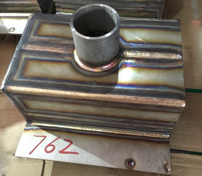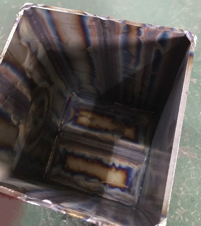 对于第三模块中不锈钢结构件的焊接,个人观点是其焊接难点要更甚于铝合金的焊接👩🏼💻。众所周知不锈钢在高温状态下非常容易氧化,而且变形量也较大。这次的不锈钢结构件组对完毕后🍰,所有焊缝根据要求都不允许留间隙、开坡口焊接,并在背部充气的情况下实现单面焊双面成型(如图7),它的焊接难点之一首先是为防止变形,如何选择好组对之后的焊接顺序👩👧👧,其次是焊接过程中如何能够保证一次焊接背部成型和表面焊缝成型不氧化🧹,乍听起来好像这两点有些矛盾,首先要想保证在不留间隙的情况向背面焊透,就要使熔池的温度充分达到,而熔池温度一旦过高焊缝表面就很容易氧化发黑,本届比赛各路选手也是各显其能,对于氩弧焊喷嘴的使用从6号嘴到10号甚至更大都有使用⛸。其实从理论上来讲,要想使氩弧焊接不锈钢表面成型好,颜色好,主要就是气体的保护效果,如果比赛允许使用氩气保护拖罩进行三重保护,即热影响区也保护起来🙆🏿♀️,那么焊缝达到银白色的金属光泽也是有可能的🧙🏼♀️⚛️,但这次只允许两重保护(即内充气和氩弧枪本身气体)🚣🏻,那么对于焊缝的正表面只能采取大口径喷嘴进行,才能扩大保护范围,如果条件允许,也可以采用喷嘴内装有滤网的大口径喷嘴进行焊接,这样的气体保护会更均匀。但前提是采用大喷嘴口径的焊枪对焊接过程中选手对熔池观察的视线会有所影响,也要逐渐适应😾。这次大赛对于大喷嘴的使用只有少数单位想到了这一点。随着本次大赛的结束,我想以后对于不锈钢焊接的氧化问题,会有更多的单位熟悉🧓、掌握,甚至想出更好的办法来解决不锈钢焊接氧化的问题。