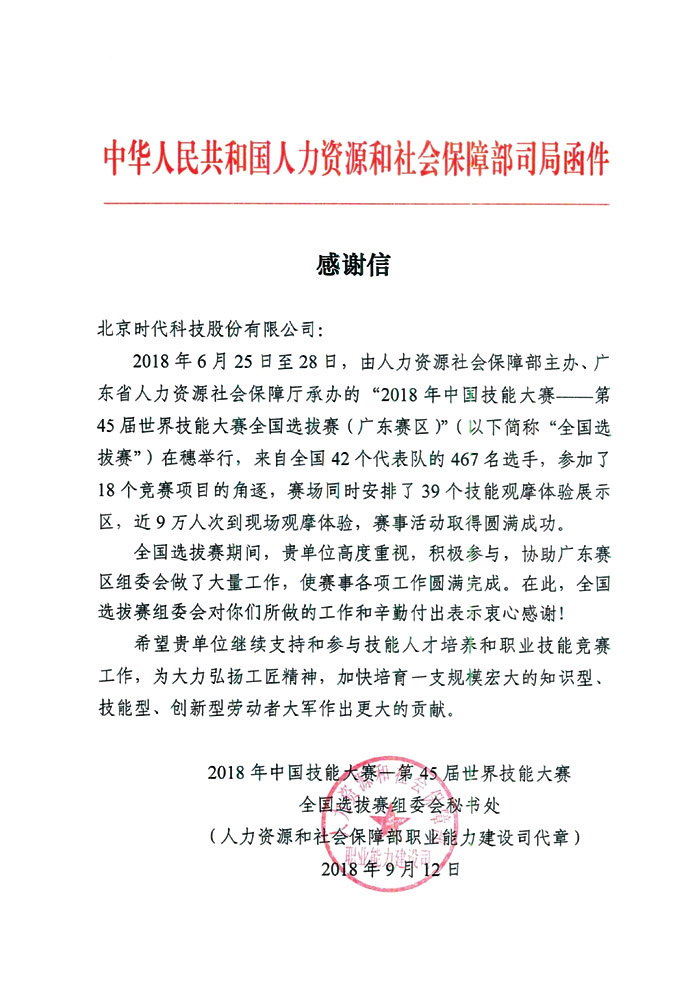 2018-09 | 第45届世界技能大会全国选拔赛 组委会感谢信 | 中国人力资源和社会保障部职业能力建设司 |