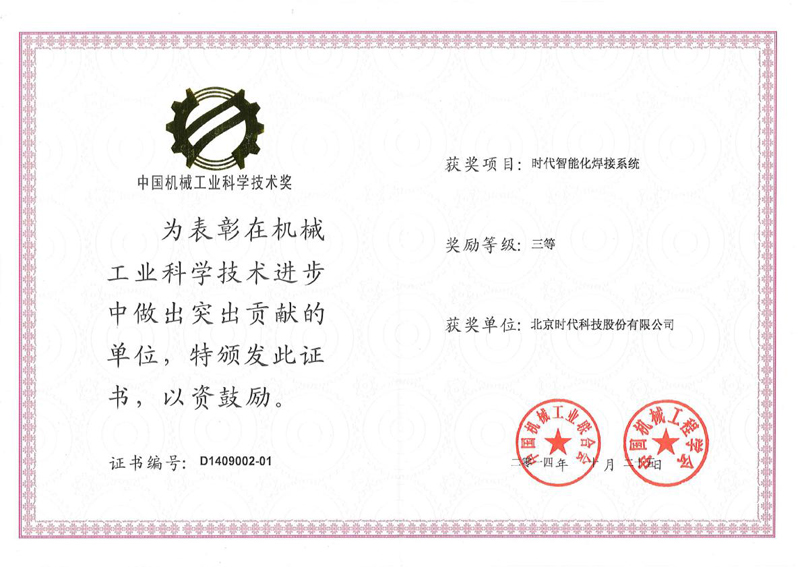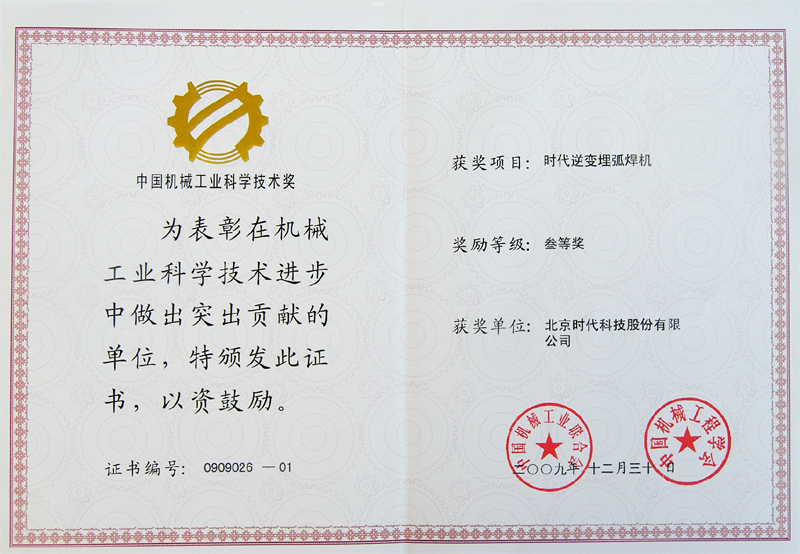 2009-12 | 中国机械工业科学技术奖 时代逆变埋弧焊机 | 中国机械工程学会 |