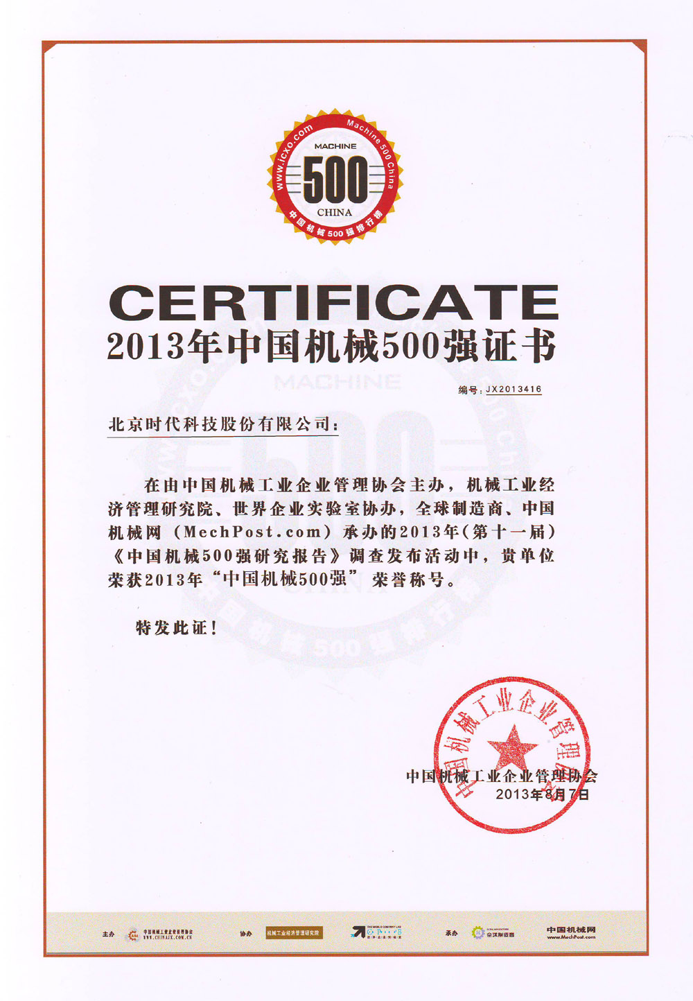 2013-08 | 中国机械500强 证书 | 中国机械工业企业管理协会 |