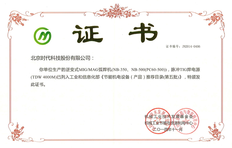 2015-01 | 工业和信息部《节能机电设备推荐目录》证书 | 机械工业技术发展基金会 |