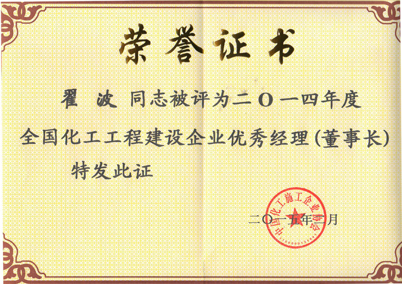 2015-02 | 2014年度全国化工工程建设单位 优秀经理(董事长) | 中国化工施工企业协会 |
