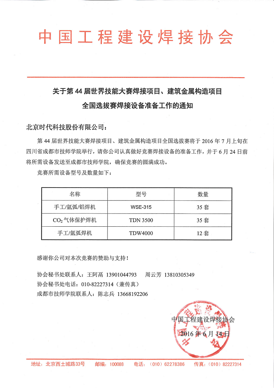 2016-06 | 第44届世界技能大赛焊接项目、建筑金属构造项目全国选拔赛唯一指定用机 | 中国工程建设焊接协会 |